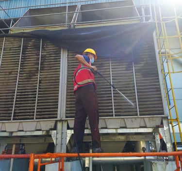 Why is it necessary to flush new cooling towers and why should general cleaning be carried out?