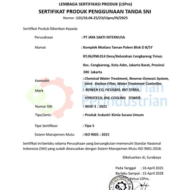 PT Jaya Sakti Internusa adalah mitra terpercaya berdiri sejak tahun 1998 yang menyediakan solusi lengkap dan terintegrasi (Total All-in-One Program) untuk semua kebutuhan pengolahan air dan perawatan sistem industri, komersial, dan gedung Anda.