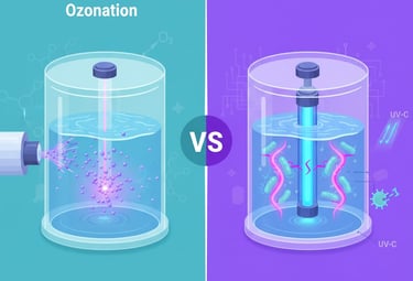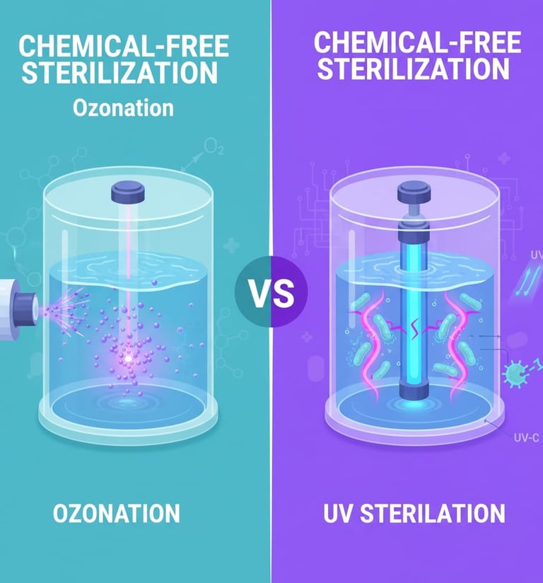Membahas kelebihan dan kekurangan ozon (oksidator kuat) dan UV (sterilisasi fisik) dalam membunuh mikroba